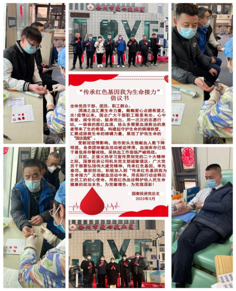 國(guó)泰投資黨總支發(fā)出了“傳承紅色基因 我為生命接力”無(wú)償獻(xiàn)血的活動(dòng)倡議。國(guó)泰職工眼里有光,心中有愛(ài),聞令而動(dòng),挺身而出,共計(jì)22名職工參與其中,累計(jì)獻(xiàn)血7200毫升,用忠誠(chéng)熱血詮釋初心使命,展現(xiàn)了無(wú)私奉獻(xiàn)護(hù)佑生命的“國(guó)企溫度”。