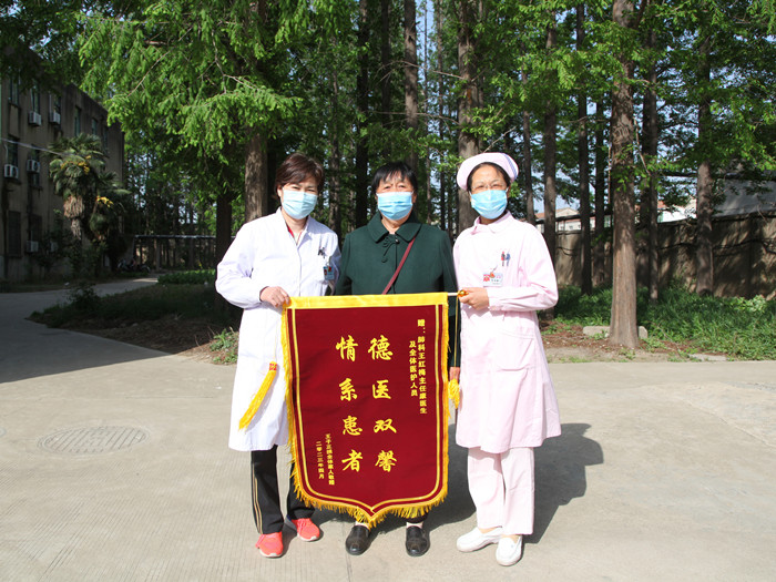 原來,這位大媽的老伴兒叫王子正,今年72歲了,是一位患有矽肺、肺心病、冠心病、腦梗塞、帕金森病等基礎(chǔ)疾病的患者,今年1月時,由于感染了新冠肺炎,王子正老人病情危重,經(jīng)過職業(yè)病科主任王紅梅及全科醫(yī)務(wù)人員的全力搶救,和三個多月的精心治療護理,現(xiàn)在身體基本康復(fù)。老人的兒子帶著父母來到醫(yī)院,向醫(yī)護人員表示誠摯感謝,王子正老人的老伴兒將錦旗親手送到了院行風辦。