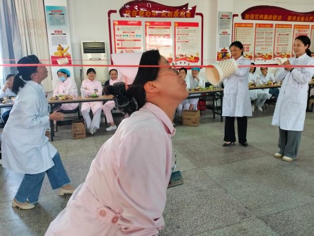 團隊競技,協(xié)作挑戰(zhàn)點燃熱情?;顒?紙杯接力"考驗技巧與速度——隊員們用嘴將紙杯從繩子的一頭吹向另外一頭。場上選手全神貫注,使出了全身的力氣吹著紙杯,臉被憋得通紅。場下隊友加油聲此起彼伏,競技與歡笑交織成熱烈畫卷;"齊頭并進"環(huán)節(jié),每隊成員需頭對頭頂住一張A4紙、步調(diào)一致完成折返跑。隊員們互相商量著前進的步伐和技巧,爭取自己以零失誤的默契配合率先沖線。有的隊伍跑著跑著紙掉了,有的交接時帽子碰掉了,各種狀況層出不窮,笑聲頻發(fā),加油聲此起彼伏;在“搶板凳”拼手速拼腦力環(huán)節(jié),隨著音樂聲響起,5人繞著板凳轉(zhuǎn)圈,有的小心地挪動著步子,生怕音樂停止時錯過了板凳,有的看似漫不經(jīng)心,實則心中有數(shù),音樂一停,大家趕緊搶板凳坐下。