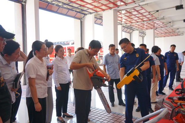 全體人員首先實(shí)地參觀了消防救援支隊(duì)特勤一站的救援車輛與裝備,消防員詳細(xì)講解了各類器材的功能與應(yīng)用場(chǎng)景,展示了快速破拆、水槍射流等實(shí)戰(zhàn)操法,精湛技能和颯爽英姿贏得陣陣掌聲。在體驗(yàn)環(huán)節(jié),青年代表體驗(yàn)了消防液壓剪切鉗、消防水帶的操作使用。