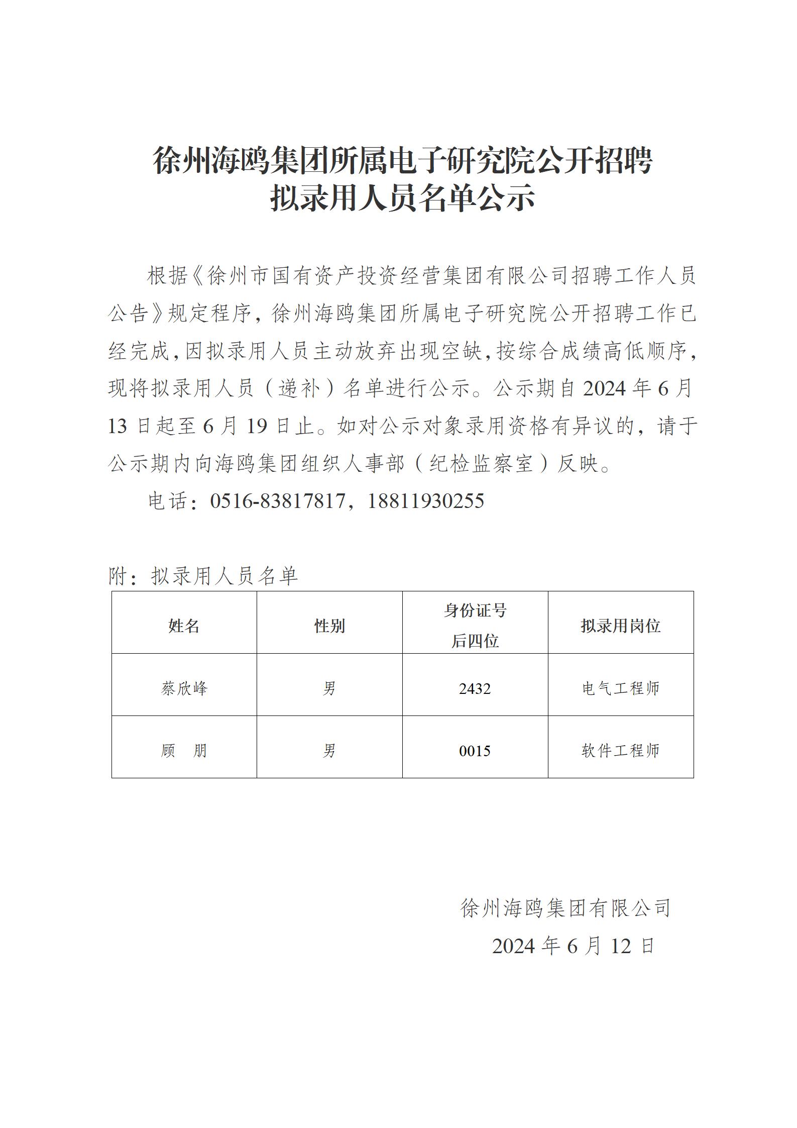徐州海鷗集團(tuán)所屬電子研究院公開招聘擬錄用人員名單公示