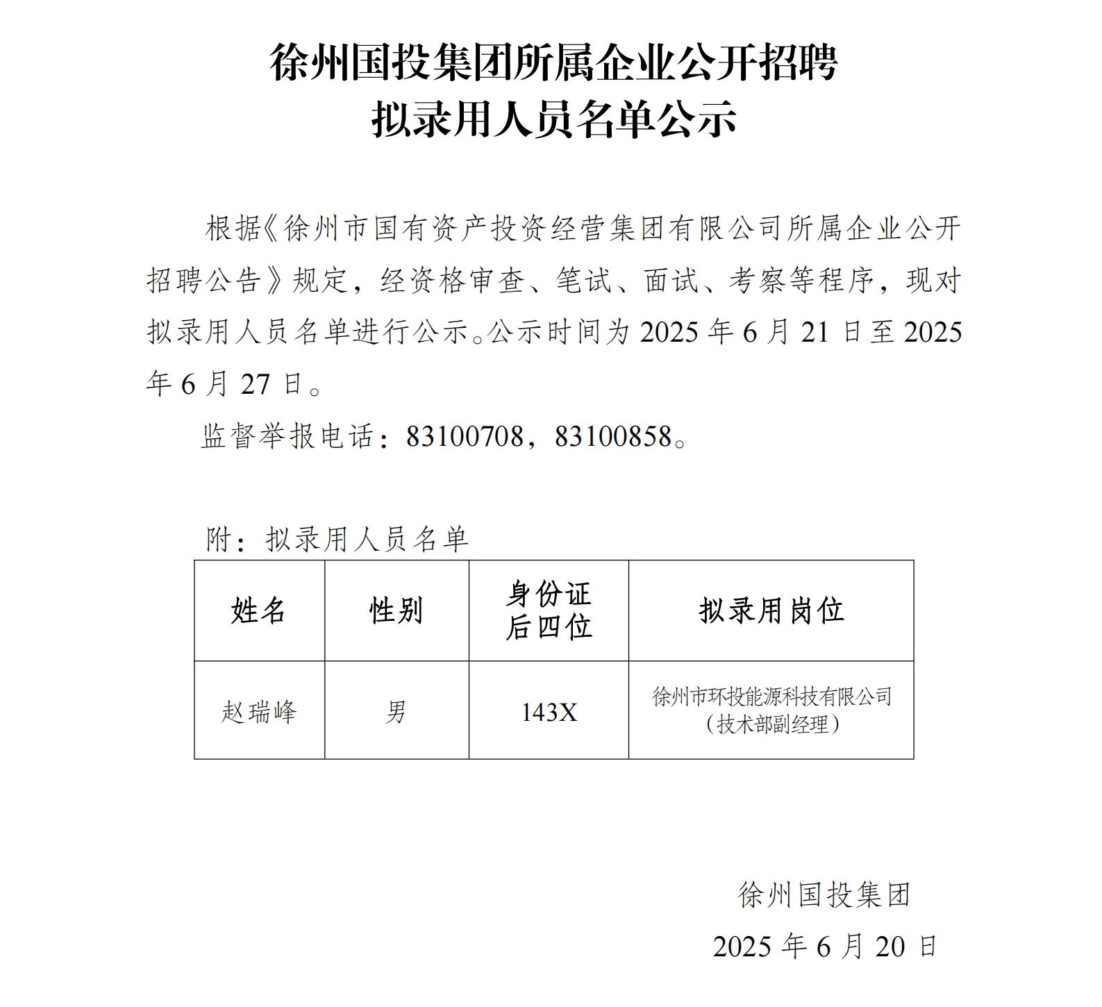 徐州國投集團所屬企業(yè)公開招聘擬錄用人員名單公示