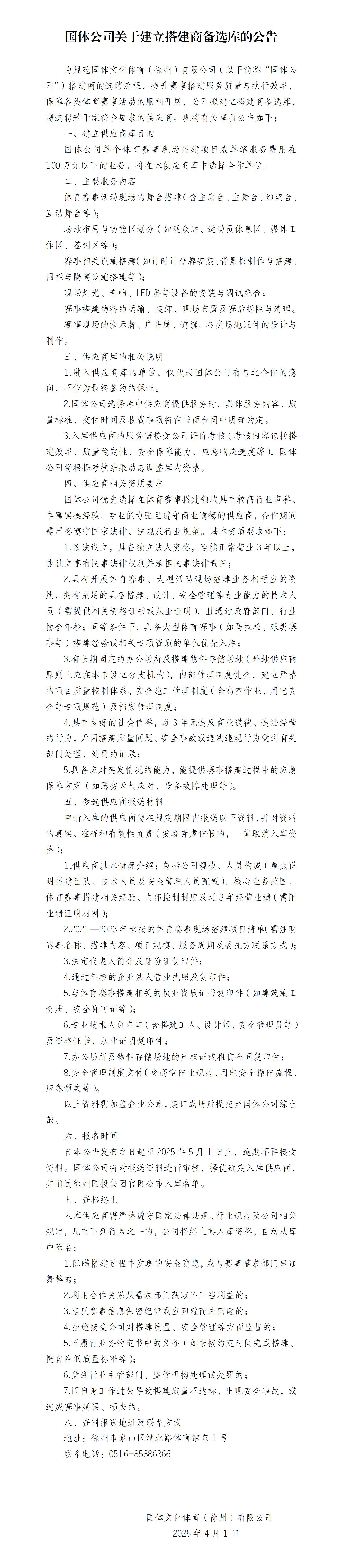 國(guó)體公司關(guān)于建立搭建商備選庫(kù)的公告