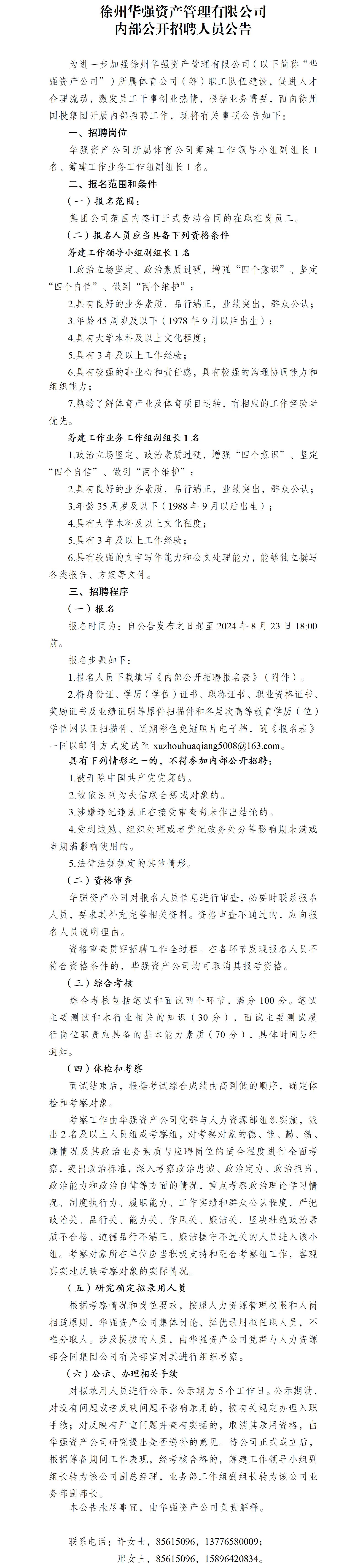 徐州華強(qiáng)資產(chǎn)管理有限公司內(nèi)部公開招聘人員公告