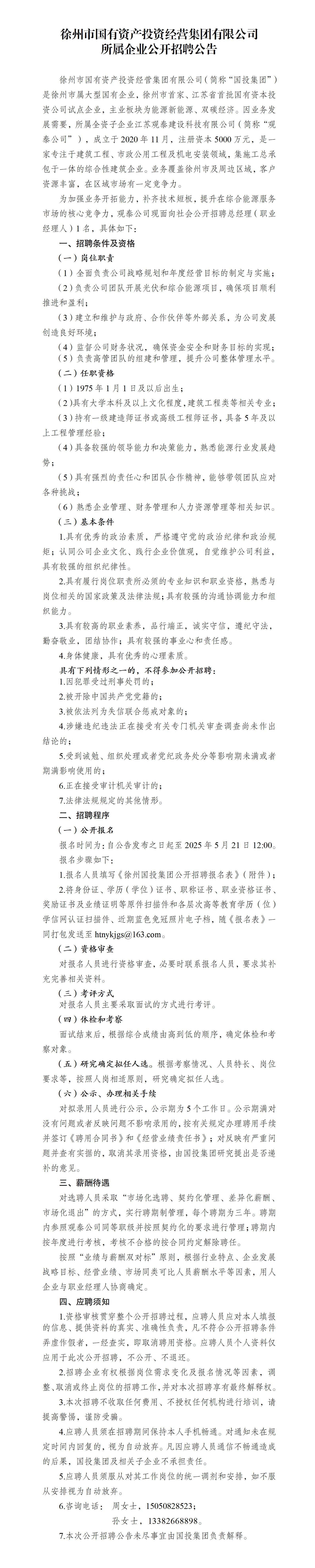 徐州市國有資產投資經營集團有限公司所屬企業(yè)公開招聘公告