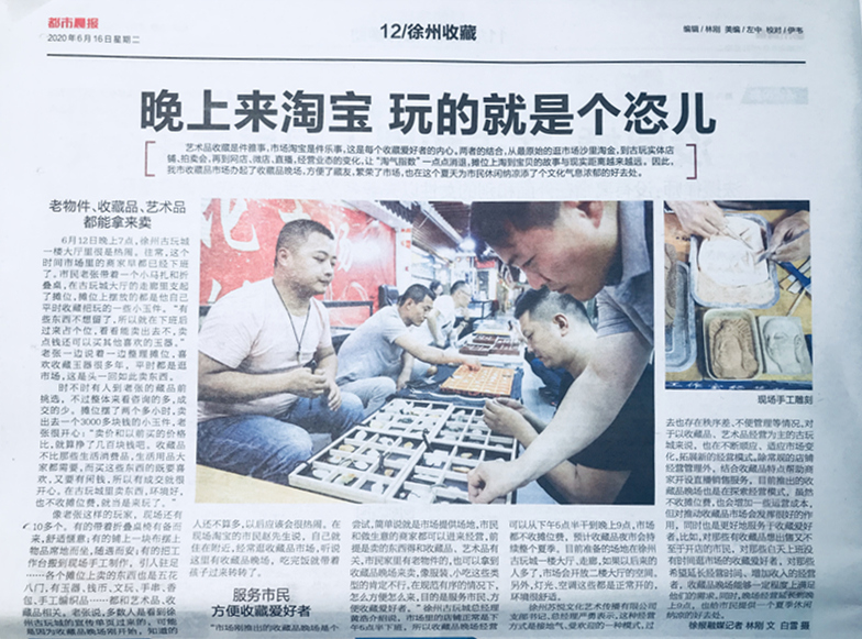 華強(qiáng)資產(chǎn)公司所屬的蘇悅公司徐州古玩城緊扣“文化搭臺經(jīng)貿(mào)唱戲”這一市場模式,積極響應(yīng)國家號召,組織開展夏季夜市淘寶活動,發(fā)展特色商圈、夜間經(jīng)濟(jì)、休閑經(jīng)濟(jì),有的放矢的幫扶商戶,讓好政策盡快落地見效,積極轉(zhuǎn)變思想,帶動疫情期間低迷的市場經(jīng)濟(jì)。6月12日活動拉開帷幕,很多家商戶拿出看家寶貝進(jìn)行地?cái)傉故荆蛊穮R集珠寶玉石、紫砂陶瓷、石雕木雕、手串文玩、文房四寶、書畫精品、特色手工藝品等,各類展品融合輝映,同場競秀。自活動開展以來得到了市場業(yè)戶的一致好評和廣大古玩收藏愛好者的積極響應(yīng),在炎炎夏日也為廣大市民提供了又一集納涼休閑、淘寶購物的好去處。徐州都市晨報(bào)對此進(jìn)行了專項(xiàng)采訪,并于6月16日(周二),在顯著位置進(jìn)行了刊登報(bào)道。