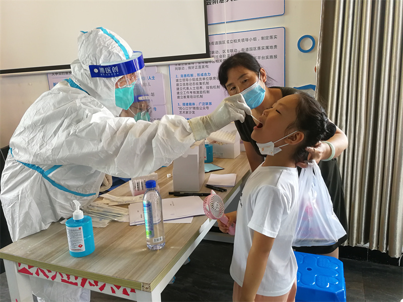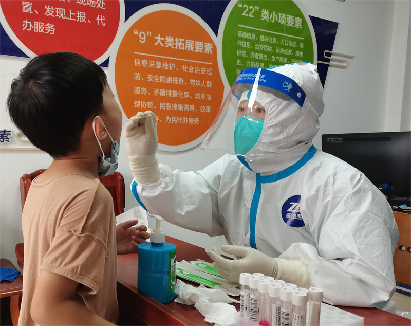 條件的簡陋,為采樣工作增加了難度。在炎熱的環(huán)境下,她們穿著密不透風(fēng)的防護(hù)服,帶著N95口罩、面屏和多層手套,不停地為持續(xù)不斷到來的居民進(jìn)行采樣。大到90多歲的老人,小到幾個月的嬰兒,一直戰(zhàn)斗到晚上11點(diǎn)多,在8個小時的時間里,憑著她們麻利地操作和熟練的技術(shù),共為4000人完成了核酸采樣。采樣結(jié)束后,有的姐妹累得撐不住了,脫了防護(hù)服,顧不得雨天地面的潮濕,直接躺在了生硬的水泥地上。