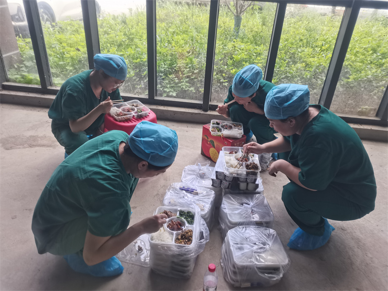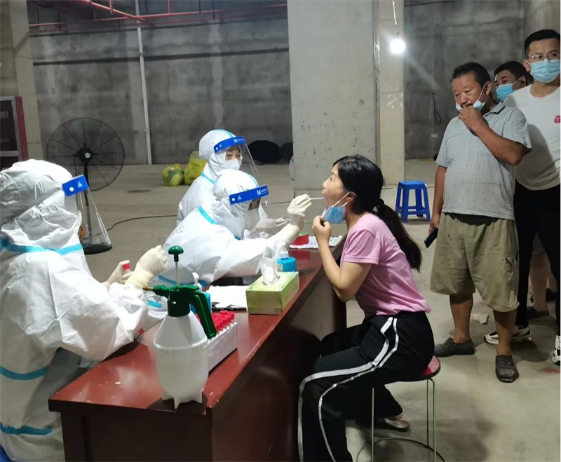 8月1日,在35℃的高溫下,需要入戶為行動不便、分散在各個村莊的居民進(jìn)行采樣,鄉(xiāng)間道路狹窄,無法車接車送,只能步行前往。穿著多層的防護(hù)服,在烈日下奔波,悶熱的程度難以想象。有的姐妹恰巧處于特殊生理期,悶熱加上勞累,身體幾乎要虛脫了,仍然堅(jiān)強(qiáng)地奮戰(zhàn)在前面,堅(jiān)決不退場,圓滿完成了采樣任務(wù)。由于穿著防護(hù)服,每次至少要連續(xù)工作4個小時以上,為了避免上廁所的麻煩,她們不敢喝水,在炎熱的天氣里只能忍受著饑渴。