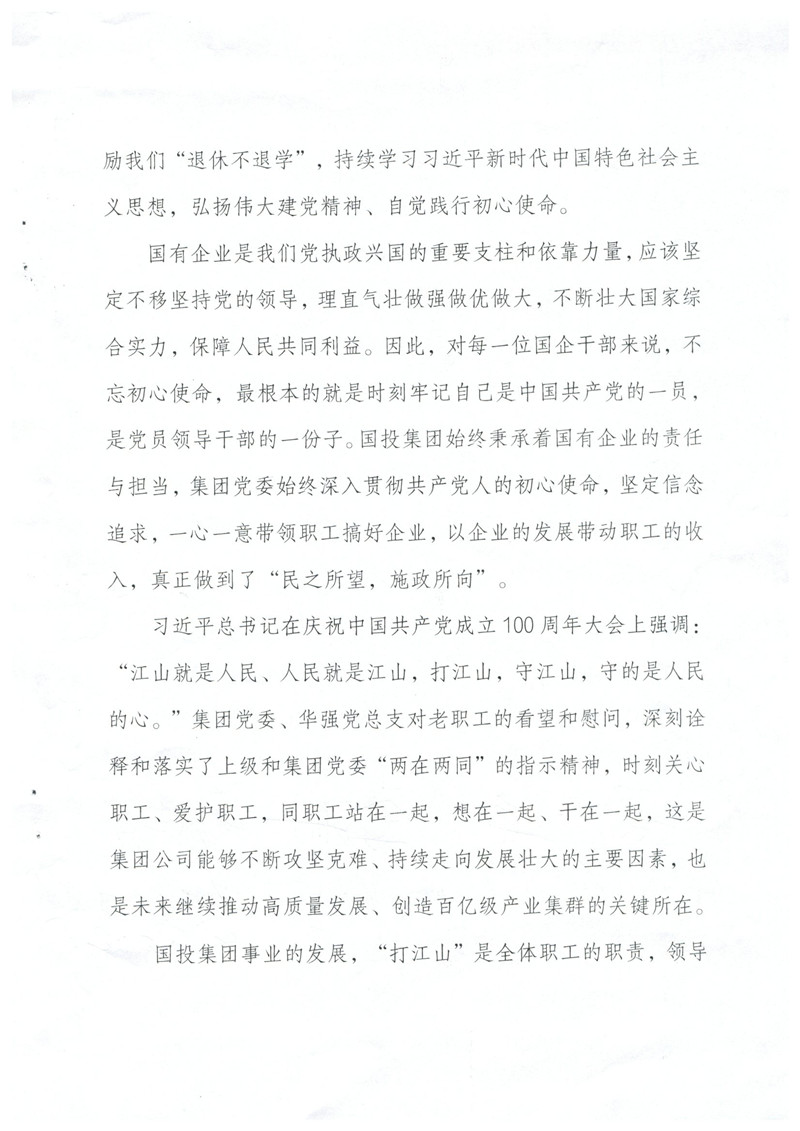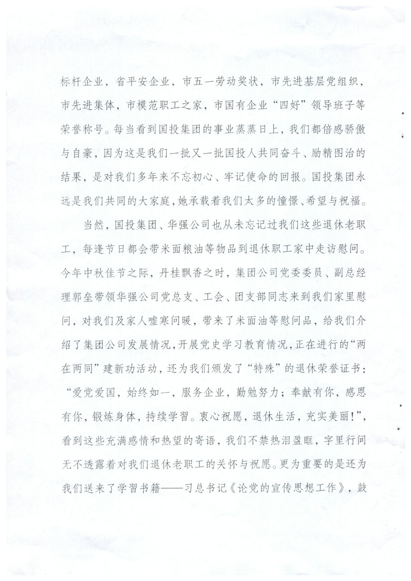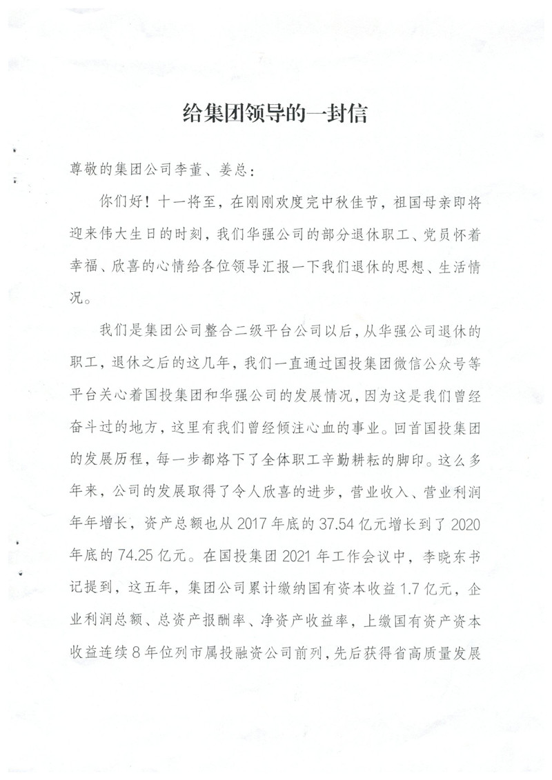 您們好!來信收悉。在中秋佳節(jié)之后,國(guó)慶即將來臨之時(shí),收到老同志們的來信,倍感親切,老同志們退休不退出,一直關(guān)心支持國(guó)投集團(tuán)改革發(fā)展情況并積極建言獻(xiàn)策的精神讓我們感動(dòng),正是由于像您們一樣的徐州國(guó)投老同志們的無私奉獻(xiàn)和精神感召,全集團(tuán)2000余名在崗職工勤勉履職,愛崗敬業(yè),開創(chuàng)了徐州國(guó)投來之不易的發(fā)展成績(jī),我們表示非常感謝,并向您們和國(guó)投集團(tuán)全體退休老同志致以誠(chéng)摯的問候!