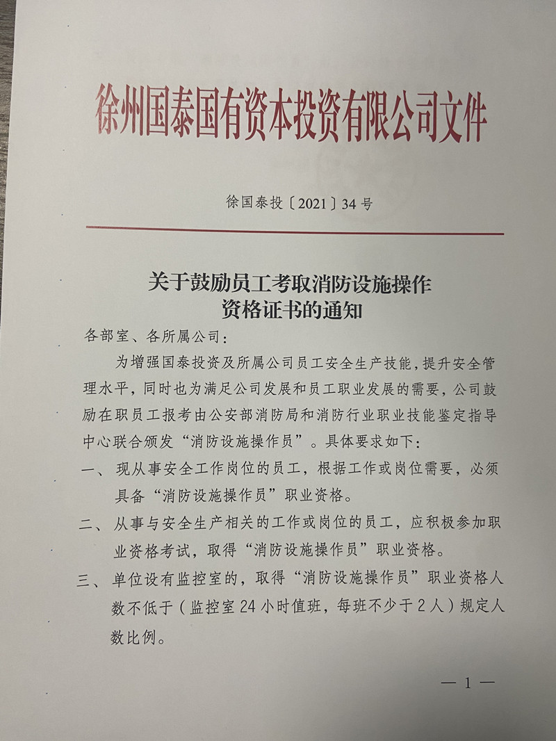 10月13日國泰投資印發(fā)《關(guān)于鼓勵員工考取消防設(shè)施操作資格證書的通知》,作為全員安全教育培訓(xùn)工作的一部分,著力增強所屬員工安全生產(chǎn)技能,提升安全管理水平?!锻ㄖ讽槕?yīng)了公司發(fā)展和員工職業(yè)發(fā)展的需要,充分調(diào)動了全員有針對性學(xué)技能考證書的熱情,體現(xiàn)了組織的整體目標(biāo)和員工個人目標(biāo)的統(tǒng)一性。