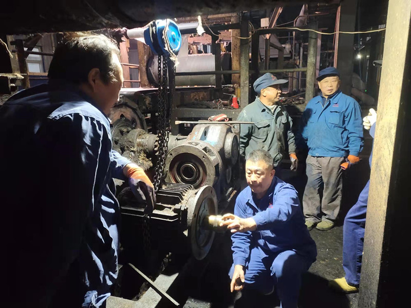 功夫不負(fù)有心人,經(jīng)過(guò)仔細(xì)測(cè)量,發(fā)現(xiàn)電機(jī)和減速機(jī)的聯(lián)軸器部分花鍵磨損,使得減速機(jī)和電機(jī)脫離,造成動(dòng)力丟失。找到癥結(jié)后,大家雖如釋重負(fù),但一刻也沒(méi)有停歇,而是選擇繼續(xù)奮戰(zhàn),對(duì)聯(lián)軸器部位重新定位安裝,其他設(shè)備也全部安裝恢復(fù),確保尺寸正確后裝機(jī)運(yùn)轉(zhuǎn),試運(yùn)行顯示正常,掌聲不約而同地劃破寂靜的車(chē)間。