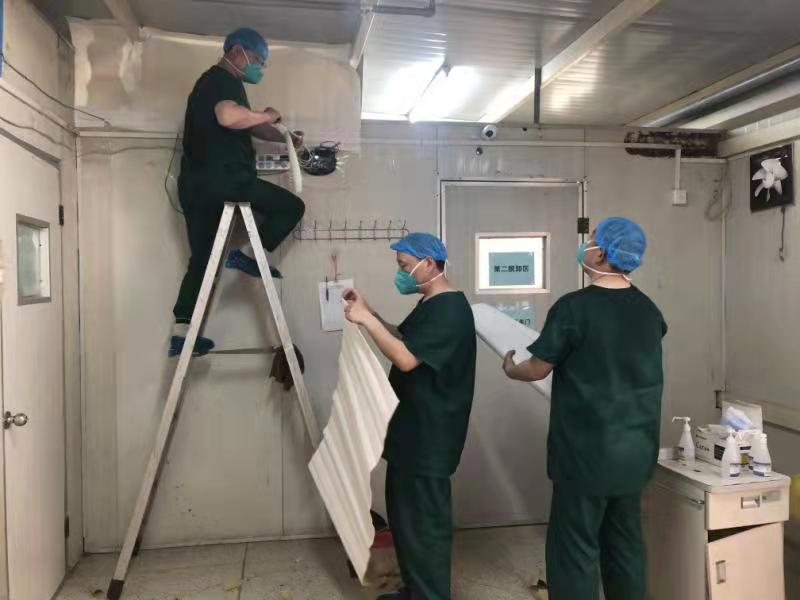 院領(lǐng)導(dǎo)班子深入“污染區(qū)”一線,經(jīng)過現(xiàn)場勘查,克服疫情期間物資缺乏、沒有施工人員的困難,制定了用現(xiàn)成材料低成本施工的方案,工會主席高磊同志和信息科李峰科長一起帶領(lǐng)大家在污染區(qū)內(nèi)爭分奪秒現(xiàn)場進行整改落實。歷時兩天保質(zhì)保量完成了施工任務(wù),有力保障了醫(yī)院的平穩(wěn)安全運營。