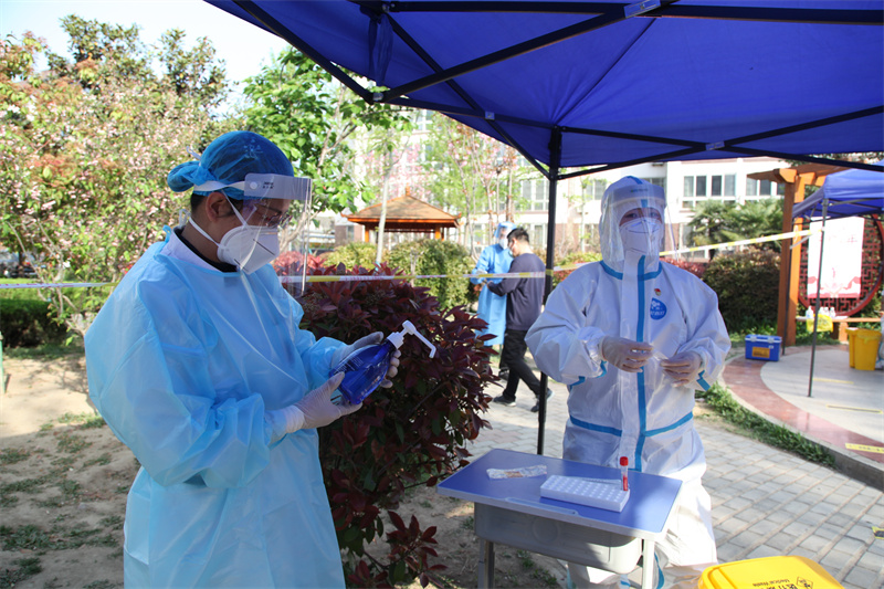 副院長張文權(quán)下班后沒有回家,來到所負責的采樣點,帶頭穿上防護服當起了志愿者,為采樣居民進行信息登記。
