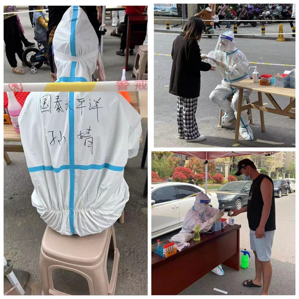 家是最小國,國是千萬家。在疫情防控當下,有這樣一對夫妻,他們不計“小家”得失,以“大家”為重,夫妻雙雙下沉到抗疫一線,她叫孫婧,是徐州國泰太平洋酒店的一名財務人員,“黨有召喚,我有行動”這一直是孫婧這位新黨員的堅守。當徐州的疫情襲來之際,孫婧愛人是第一批“黃碼”人員,待黃碼轉為綠碼后,他們第一時間下沉到社區(qū),將孩子托付給家中老人照看后,便毅然奔赴到抗疫一線。與社區(qū)工作者入戶逐一排查,幫助社區(qū)宣傳疫情防控政策,防疫常識等。即使云龍區(qū)綠碼暫停核酸檢測,夫妻二人依然積極地到重點區(qū)域參與核酸檢測的工作,與社區(qū)工作者入戶逐一排查,兩個人互相鼓勵,做彼此堅強的后盾。疫情無情,人間有愛,疫情打亂了夫妻小家的節(jié)奏,卻讓黨性在這個時刻愈加熠熠生輝。