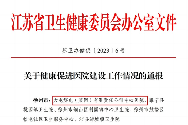 喜報!近日,在江蘇省衛(wèi)生健康委員會發(fā)布的《關(guān)于健康促進醫(yī)院建設(shè)工作情況的通報》中,大屯煤電公司中心醫(yī)院順利通過江蘇省健康促進醫(yī)院評審,被確定為江蘇省健康促進醫(yī)院,并位居本次徐州市獲評省級健康促進醫(yī)院榜首。