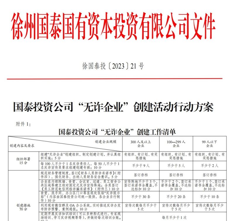 為順利推進(jìn)“無(wú)詐企業(yè)”創(chuàng)建工作,國(guó)泰投資公司成立“無(wú)詐企業(yè)”創(chuàng)建工作領(lǐng)導(dǎo)小組,制定《“無(wú)詐企業(yè)”創(chuàng)建工作清單》,強(qiáng)調(diào)要加強(qiáng)防范電信網(wǎng)絡(luò)詐騙學(xué)習(xí)、加強(qiáng)內(nèi)外部反詐宣傳以及運(yùn)用科學(xué)技術(shù)加強(qiáng)保障等方面的工作,樹(shù)立保護(hù)職工“錢(qián)袋子”就是促進(jìn)企業(yè)安全生產(chǎn)、健康發(fā)展理念,共同努力打造“無(wú)詐企業(yè)”良好形象。