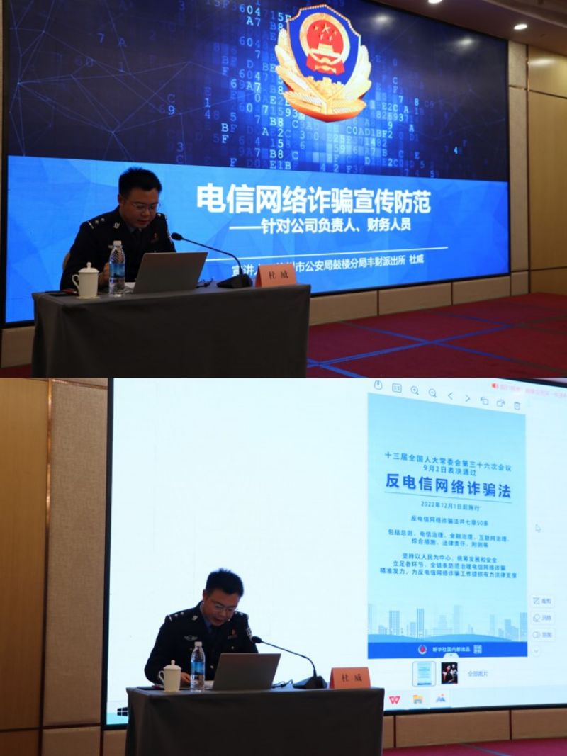 國(guó)泰投資公司以“無(wú)詐企業(yè)”創(chuàng)建活動(dòng)為牽引,邀請(qǐng)徐州市公安局鼓樓分局豐財(cái)派出所杜所長(zhǎng)擔(dān)任主講人,開(kāi)展了一期“電信網(wǎng)絡(luò)詐騙防范宣傳”專(zhuān)題培訓(xùn)。杜所長(zhǎng)以近期頻發(fā)的電信網(wǎng)絡(luò)詐騙真實(shí)案件為例,為員工深入剖析電信詐騙的基本類(lèi)型、話(huà)術(shù)特點(diǎn)、基本流程以及防范措施,用“以案釋法”的方式講解了冒充客服詐騙、AI科技詐騙、刷單詐騙、公檢法詐騙等常見(jiàn)手段,從不同角度為員工講授防騙知識(shí),同時(shí)也向員工普及了《網(wǎng)絡(luò)安全法》《反電信詐騙法》《個(gè)人信息保護(hù)法》等相關(guān)的法律法規(guī)知識(shí)。