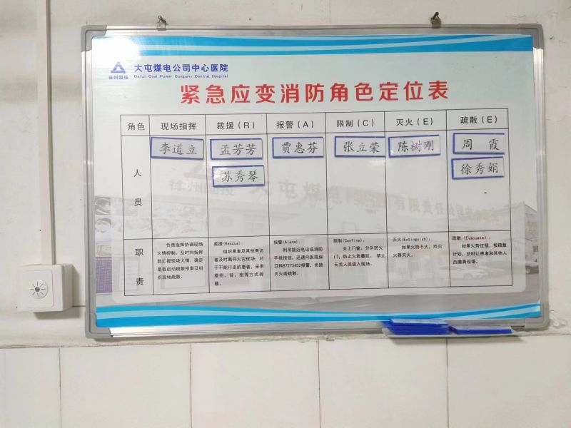 為明確各級崗位人員火災救援分工職責,建立火災快速響應機制,大屯公司中心醫(yī)院在學習總結(jié)先進工作經(jīng)驗的基礎(chǔ)上,結(jié)合實際情況,設立了“科室火災角色定位分工展示牌”,以明確在班職工的消防角色定位,提高職工的消防滅火和應急疏散能力。