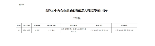 1月3日,國(guó)務(wù)院國(guó)資委發(fā)布《關(guān)于第四屆中央企業(yè)熠星創(chuàng)新創(chuàng)意大賽獲獎(jiǎng)名單的通報(bào)》,徐州國(guó)投集團(tuán)基金投資先進(jìn)儲(chǔ)能賽道項(xiàng)目北京鑫華儲(chǔ)科技有限公司獲得三等獎(jiǎng)。