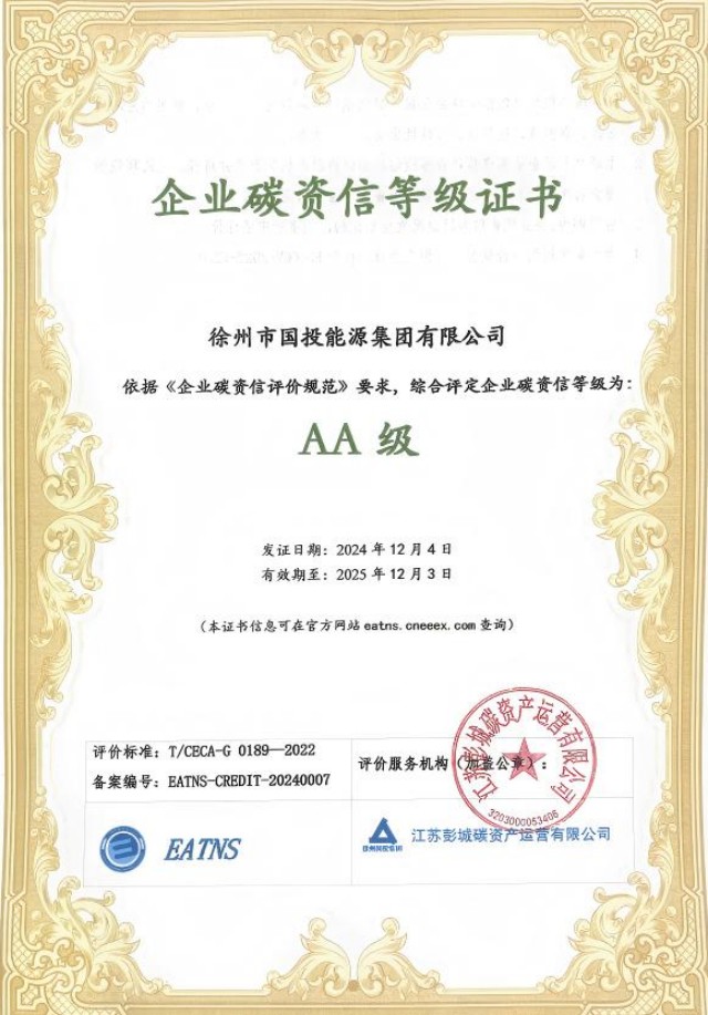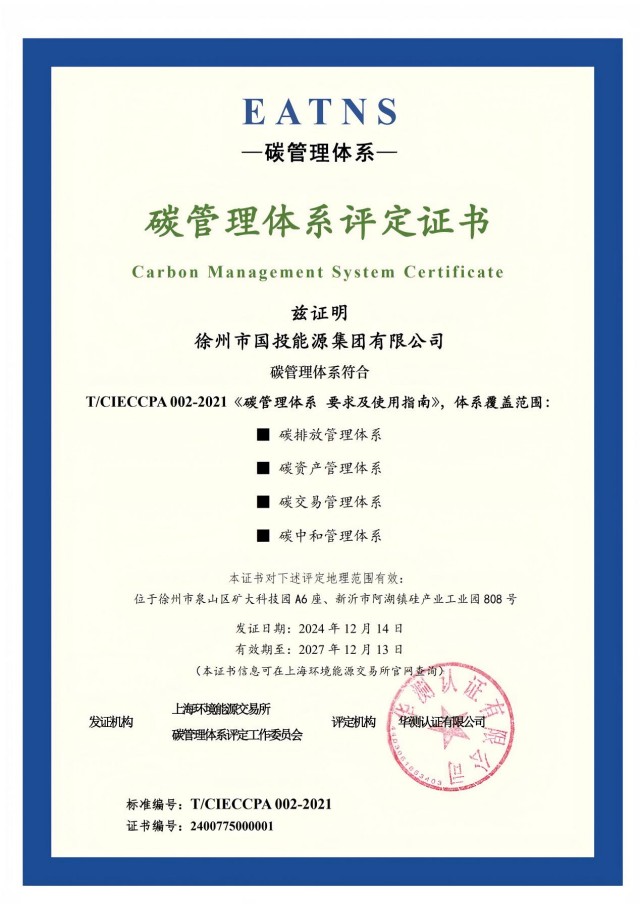 近日,在江蘇彭城碳資產(chǎn)運(yùn)營有限公司的專業(yè)咨詢協(xié)助下,經(jīng)華測認(rèn)證有限公司專家組的嚴(yán)格評審,能源集團(tuán)成功通過碳管理體系認(rèn)證審核,并獲得由上海環(huán)境能源交易所頒發(fā)的EATNS碳管理體系證書,成為全市率先獲得該體系認(rèn)證的企業(yè)。同時(shí),碳資信評價(jià)等級實(shí)現(xiàn)AA,標(biāo)志著企業(yè)在“雙碳”管理工作方面取得了重大突破。