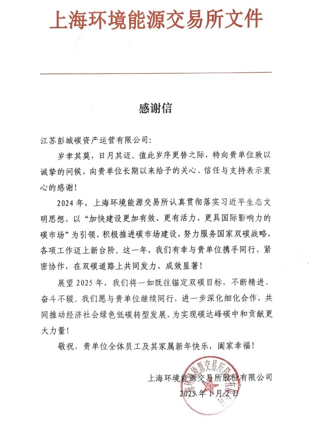 近日,彭城碳資產(chǎn)公司收獲了來自上海環(huán)境能源交易所(簡(jiǎn)稱“上海環(huán)交所”)的一封感謝信。信中表示,對(duì)彭城碳資產(chǎn)公司積極推進(jìn)碳市場(chǎng)建設(shè)表示肯定,未來將繼續(xù)同行、細(xì)化合作。