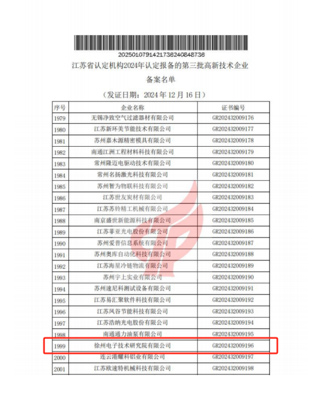 近日,高企認定網(wǎng)公布了江蘇省認定機構2024年認定報備的第三批高新技術企業(yè)備案名單的結果,徐州電子技術研究院有限公司在列,證書編號GR202432009196,標志著該公司在科技創(chuàng)新領域的實力得到了官方認可。