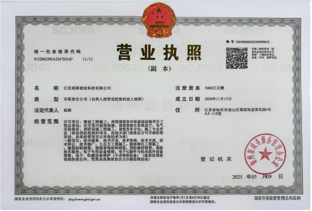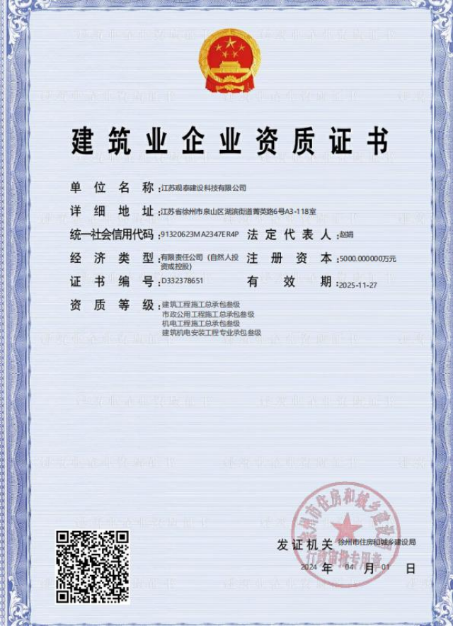 江蘇觀泰建設(shè)科技有限公司(以下簡稱“觀泰公司”)是作為徐州市屬國企重點培育的現(xiàn)代建設(shè)服務(wù)商,成立于2020年11月,注冊資本5000萬元,隸屬于徐州市國有資產(chǎn)投資經(jīng)營集團,是徐州市環(huán)投能源科技有限公司的全資子公司。公司立足“科技賦能、品質(zhì)筑基”發(fā)展理念,持有建筑工程、市政公用工程施工總承包三級、機電工程等多項專業(yè)資質(zhì),致力于為客戶創(chuàng)造顯著的經(jīng)濟和社會效益,并得到了客戶的高度認(rèn)可,現(xiàn)已形成覆蓋房建、市政、機電、智能化工程的全產(chǎn)業(yè)鏈服務(wù)能力。