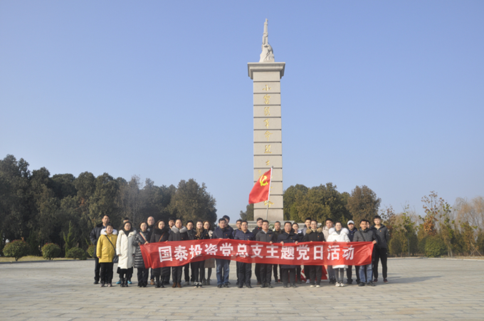 為進一步學習貫徹黨的十九大及十九屆四中全會精神,貫徹落實習近平新時代中國特色社會主義思想,圍繞“不忘初心、牢記使命”工作部署,12月24日上午,國泰投資黨總支及各所屬黨支部赴集團公司“愛國主義教育實踐基地”——新沂市小窯頭烈士陵園開展“緬懷英烈明愛國初心,學深黨史擔強企使命”主題黨日活動。黨總支及所屬支部全體黨員、積極分子及中層以上非黨員干部參加活動。